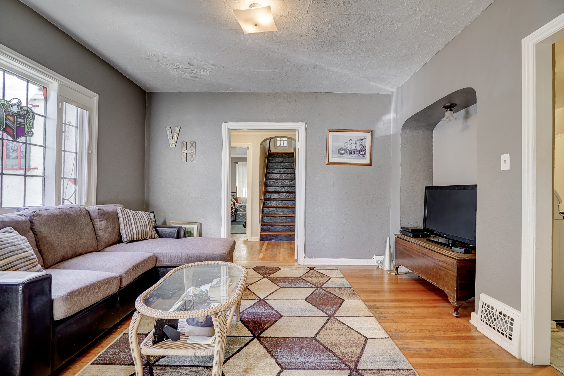 Alternate view of formal dining room/TV room. Note sideboard cut-out in wall, and stairway leading to upstairs bedroom and bathroom.