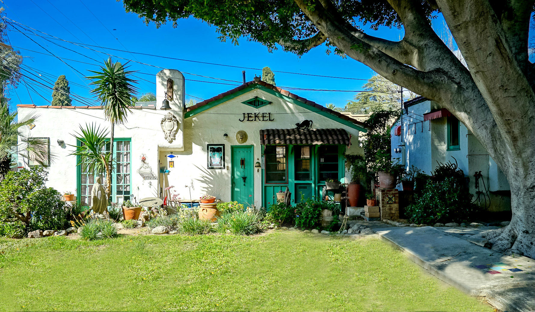 Detached garage and Jekel’s studio that have been merged into one self-contained guest house. Note Jekel’s name in wrought iron above the doorway.