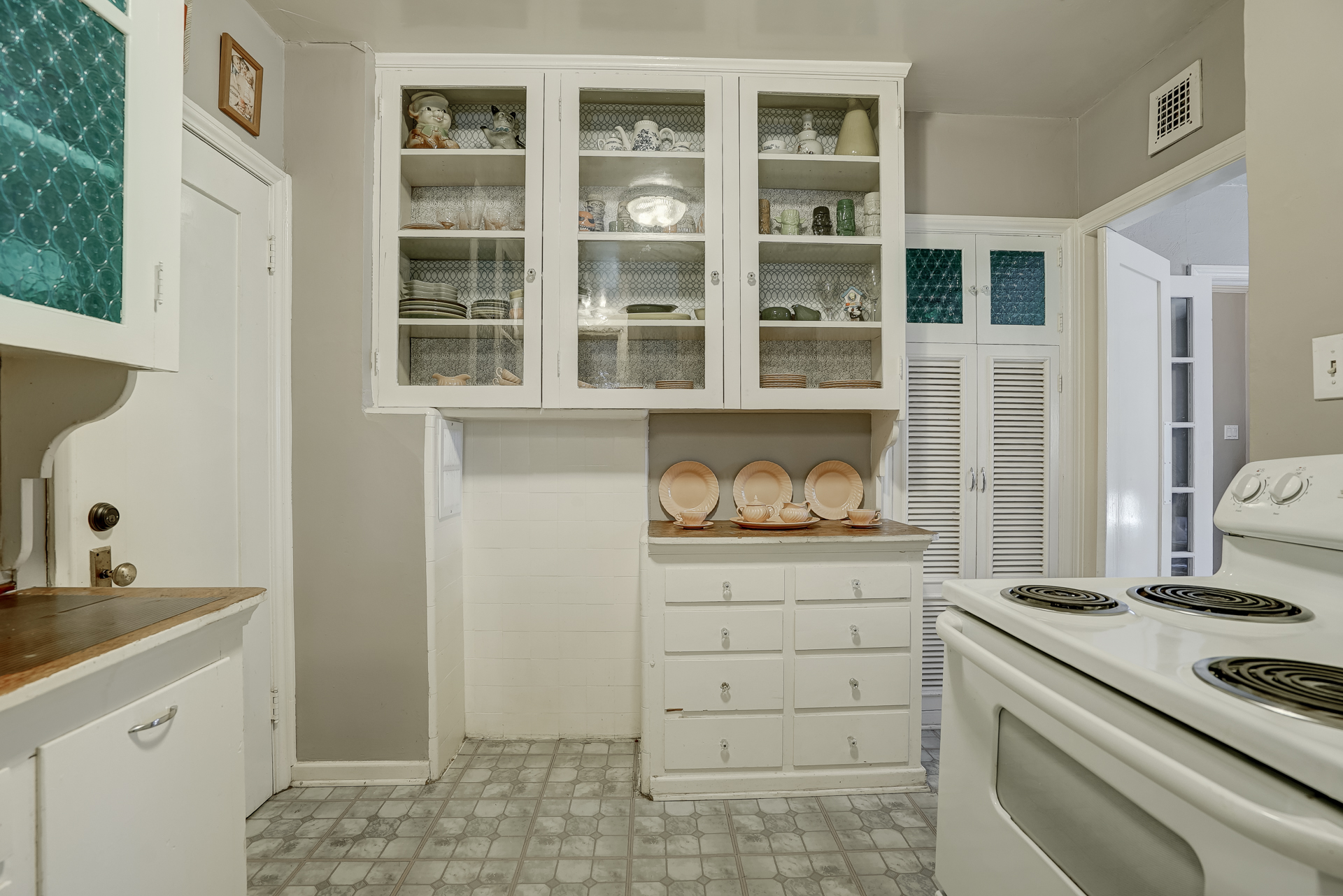 Alternate view of vintage kitchen with plenty of cabinetry. Doorway to left connects both units.