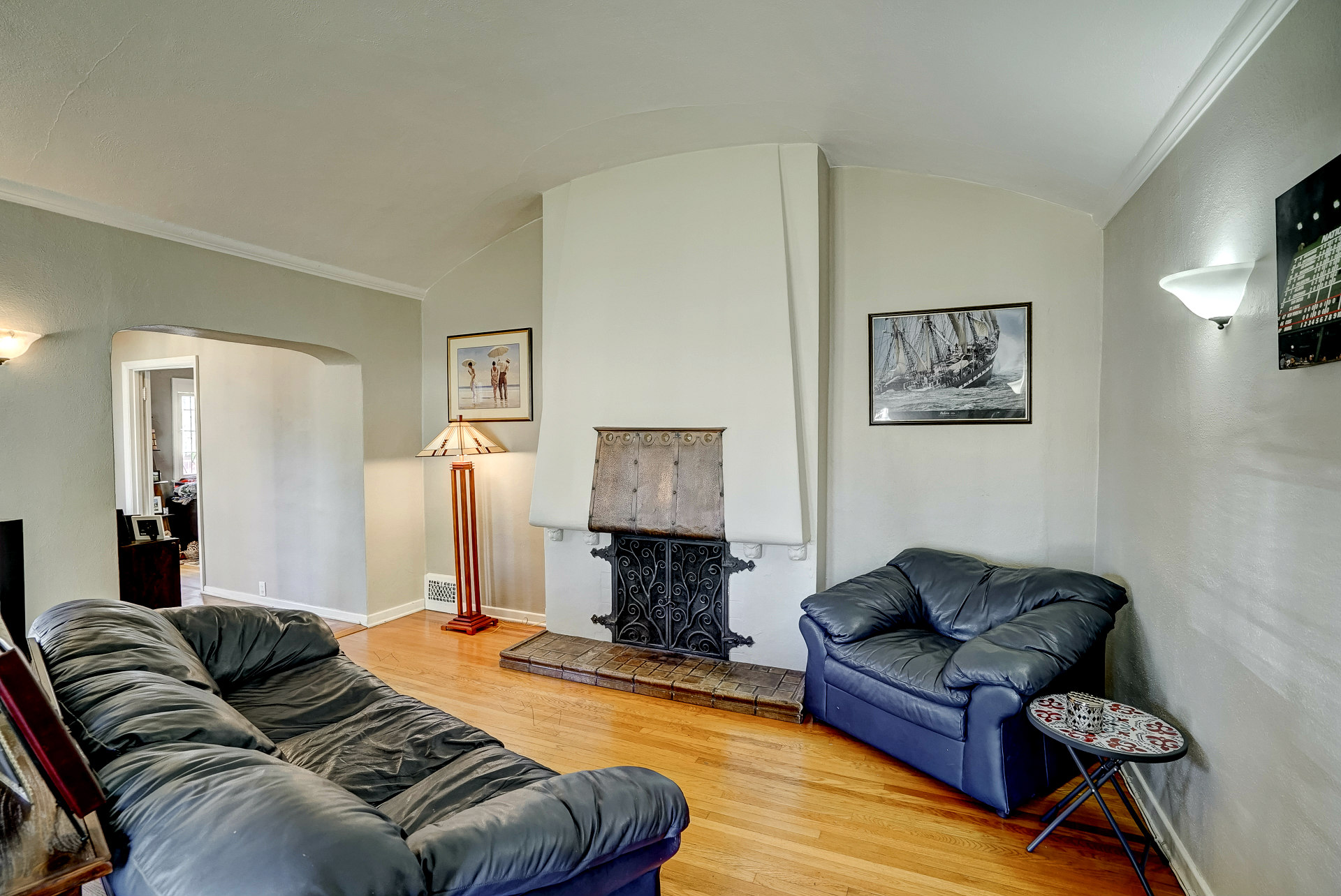 Round ceiling in living room with original hardwood floors and wood-burning fireplace.