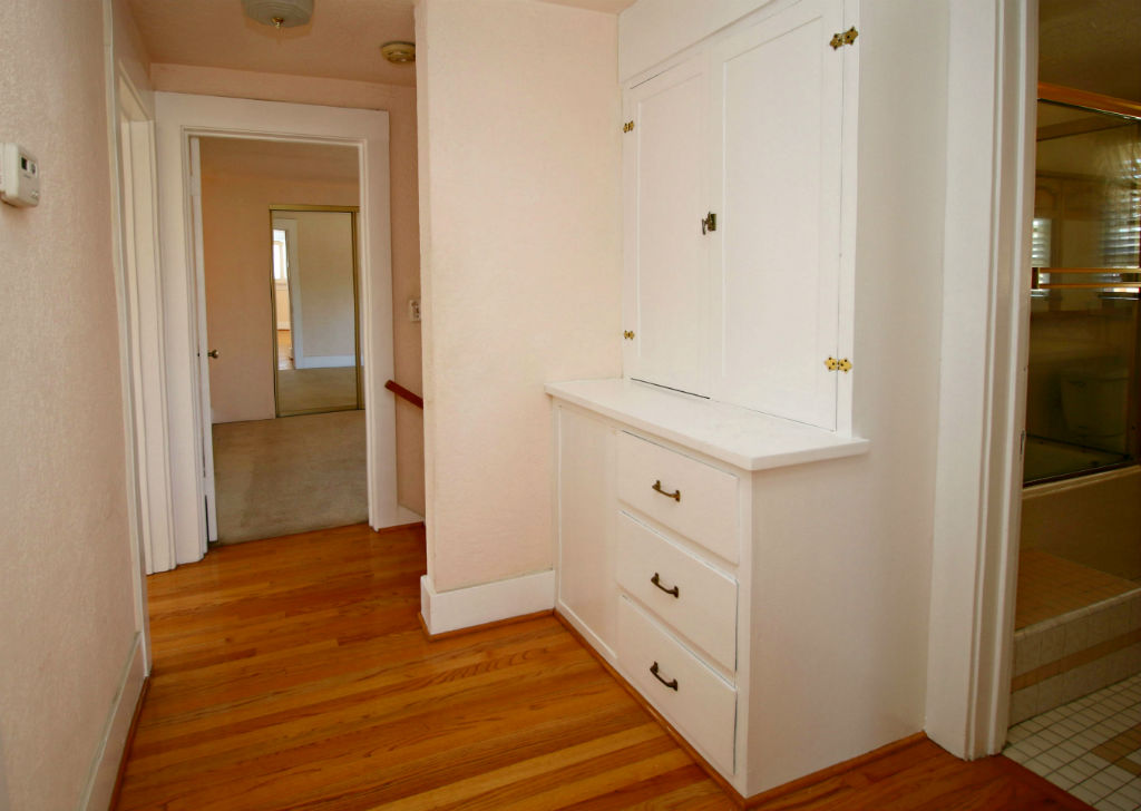 Upstairs hallway with linen closet and newer oak floors. Upstairs hallway with linen closet and newer oak floors.